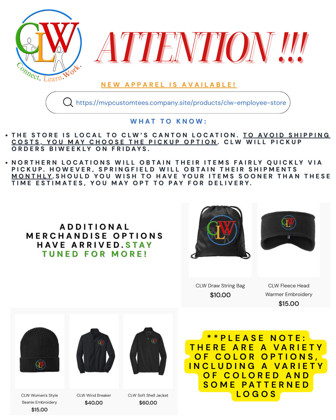 Shop the CLW Employee Store Choose from tees, hoodies, polos, and more, available in a range of styles and sizes.